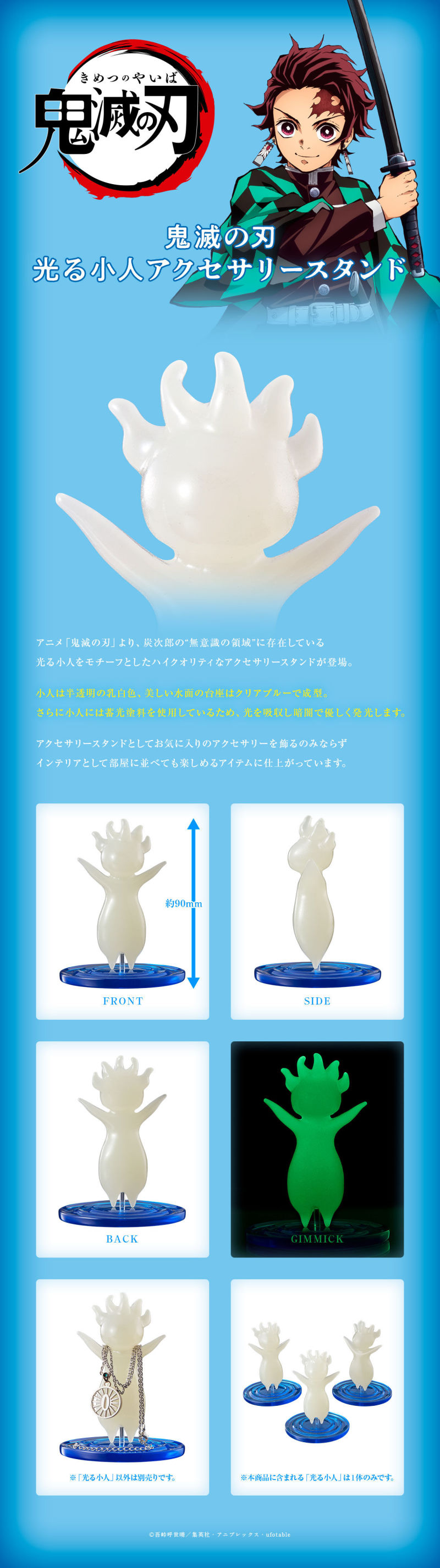 「鬼滅之刃 發光的小人配飾架」,將劇中進入炭治郎無意識領域所看到的「發光小人」立體化!尺寸約高 9 公分,以半透明乳白色材質製作出炭治郎溫柔的化身,底座美麗而清澈的水面,還原炭治郎心中一望無際、令人心曠神怡的景色;並在發光小人身上施以蓄光塗裝,吸收光線後能在黑暗中散發微光,營造光與溫暖的氛圍。發光小人高舉的手可以作為項鍊、耳環等飾品的配飾架,也可以當作一般擺飾~