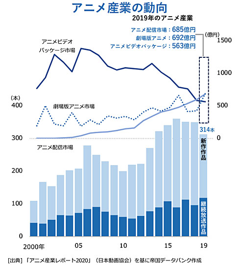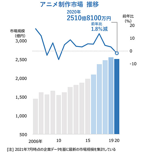 另外,動畫產業動向圖表也顯示,除了各家公司製作的電視動畫數量減少外,因為肺炎疫情的蔓延導致不少作品的製作進度延遲,也對於市場上產生了負面影響。近來中小型動畫製作公司也出現了業務整合、破產倒閉的現象,是拖累整體的因素。