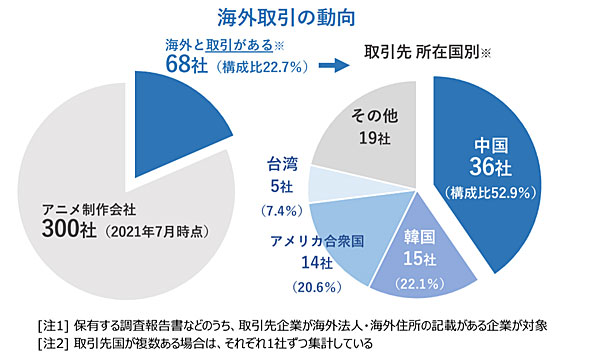 另外,目前日本動畫製作公司也漸漸發展往海外的趨勢。可以看到有超過兩成的製作公司往各地發展,其中以中國為最大宗。近年包含美國 Netflix、中國騰訊、 bilibili 等海外平台企業對日本動畫製作公司的興趣增加,獨家發行的案例越來越多。