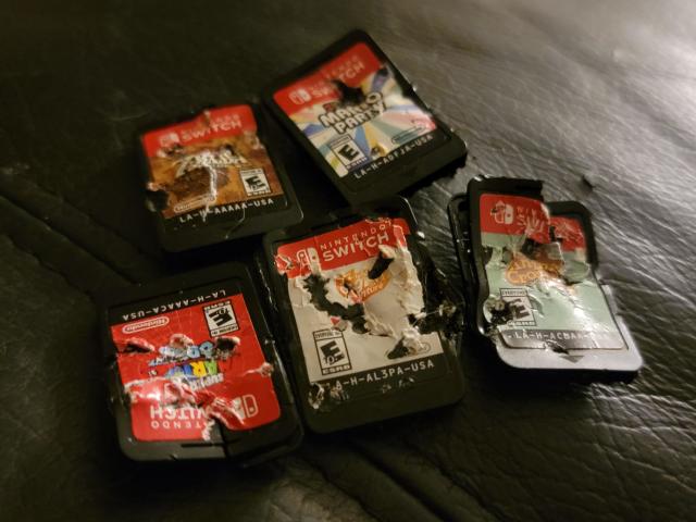 各位可以看到圖中《薩爾達傳說 曠野之息》、《瑪利歐派對》、《瑪利歐奧德賽》、《健身環大冒險》跟《集合啦!動物森友會》五張遊戲卡匣,全都被PO主所飼養的狗狗咬爛了,而且全數加起來的價額也並不算是便宜,對PO主來說,無疑是相當崩潰且心痛的一件事。