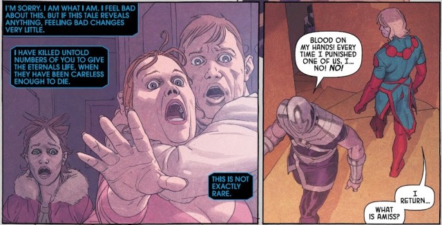 然而,這個復活過程的核心當中存在著一個可怕的秘密。正如編劇Kieron Gillen、繪師Esad Ribić在最近的《Eternals》Vol.5 #5中所接露的,每當一位永恆族重生時,都會有一個人類死去。而這一像發現導致永恆族與他們最可怕的敵人——變異族(Deviants)——建立了前所未見的夥伴關係。
