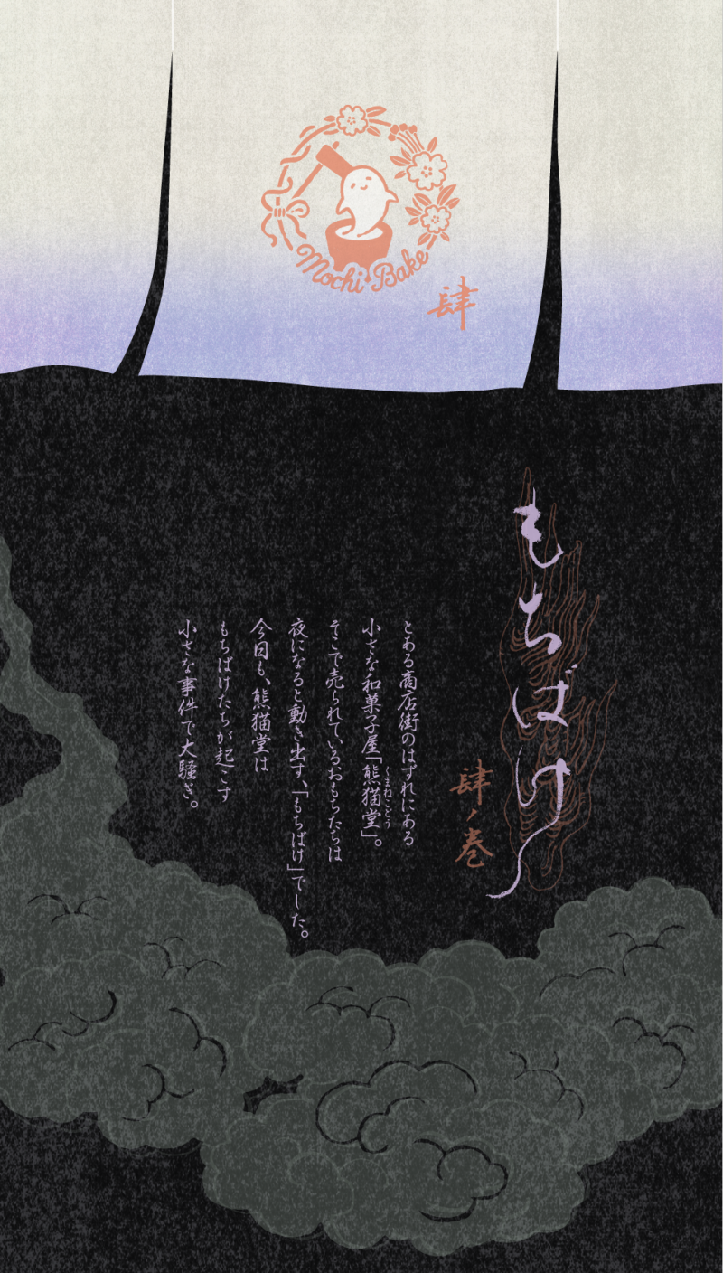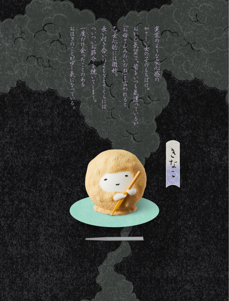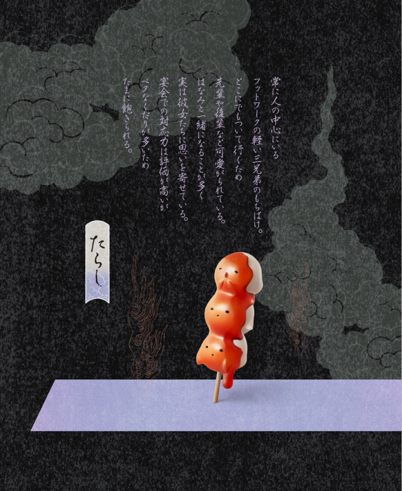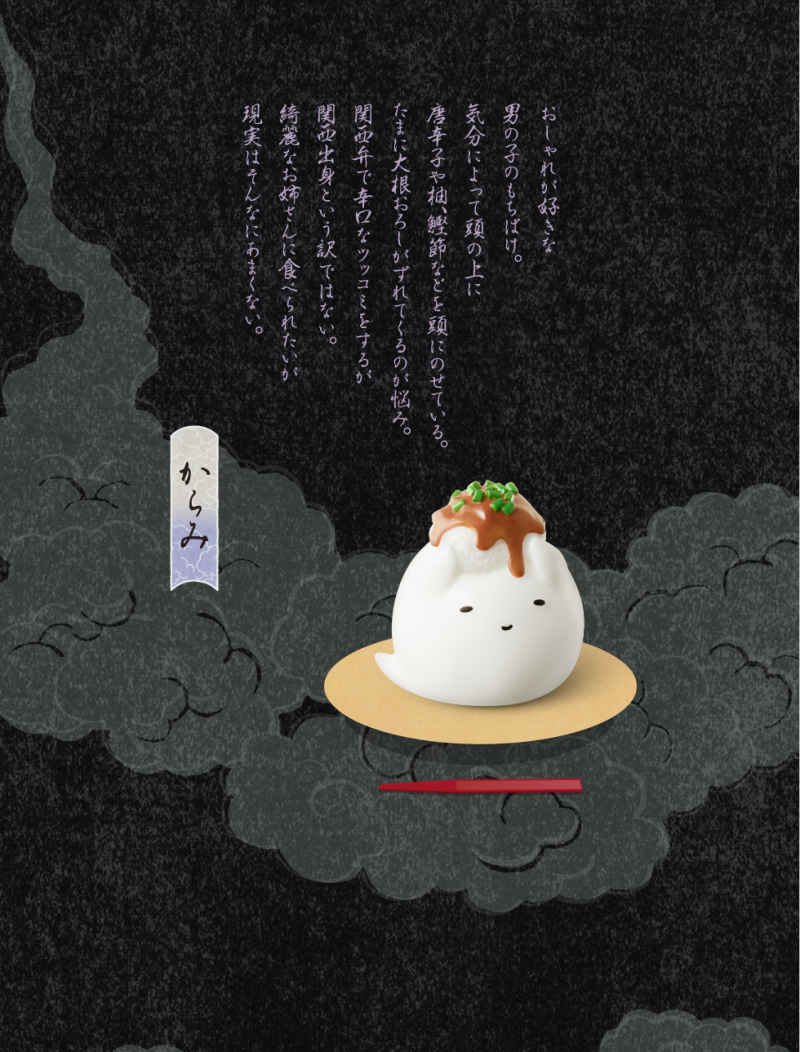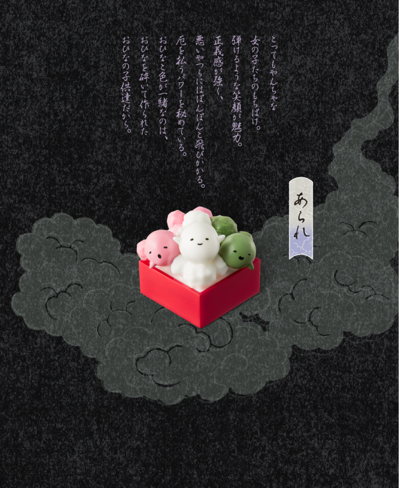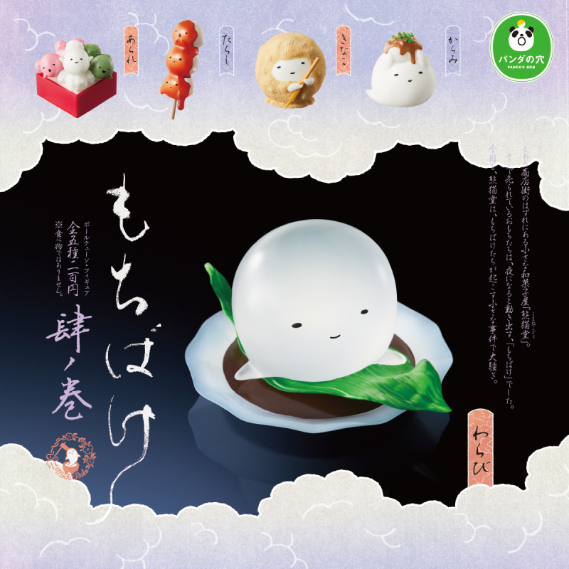 妖怪麻糬 もちばけ 是由日文「おもち(麻糬)」加上「おばけ(妖怪)」所結合而成,軟綿綿如麻糬的幽靈狀小妖怪,是熊貓之穴虛擬日式和果子店鋪「熊貓堂」的招牌,本次「妖怪麻糬 肆之卷」販售的點心有:夏季清涼透明的蕨餅、頭頂放著蘿蔔泥的辛味麻糬,以及裹滿粉的黃豆粉麻糬、三個一串的醬油糰子,以及可與上一彈女兒節三色菱形年糕搭配的綠白粉三色雛霰雛米菓!
