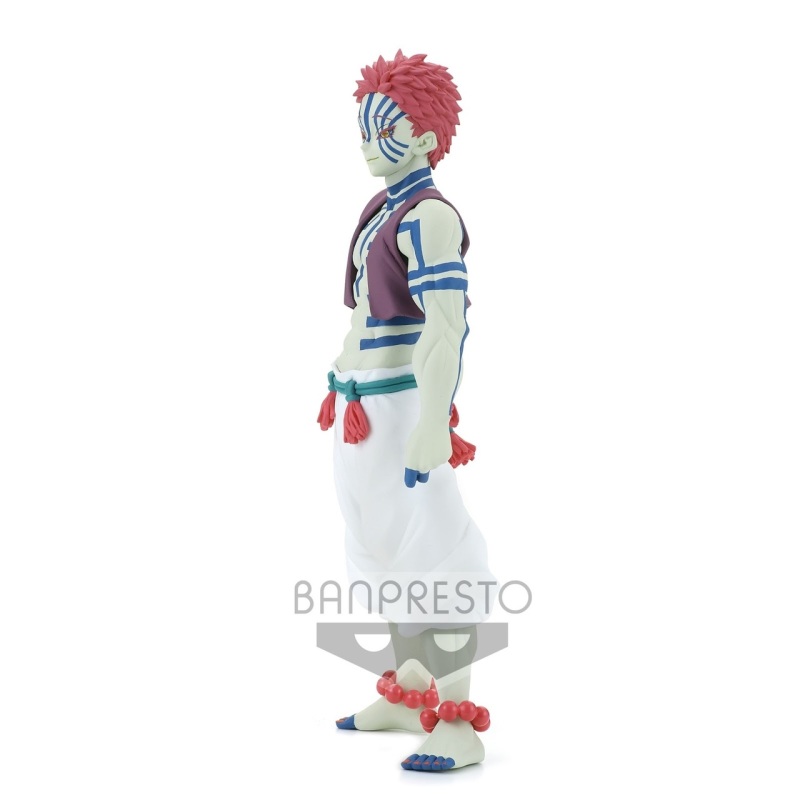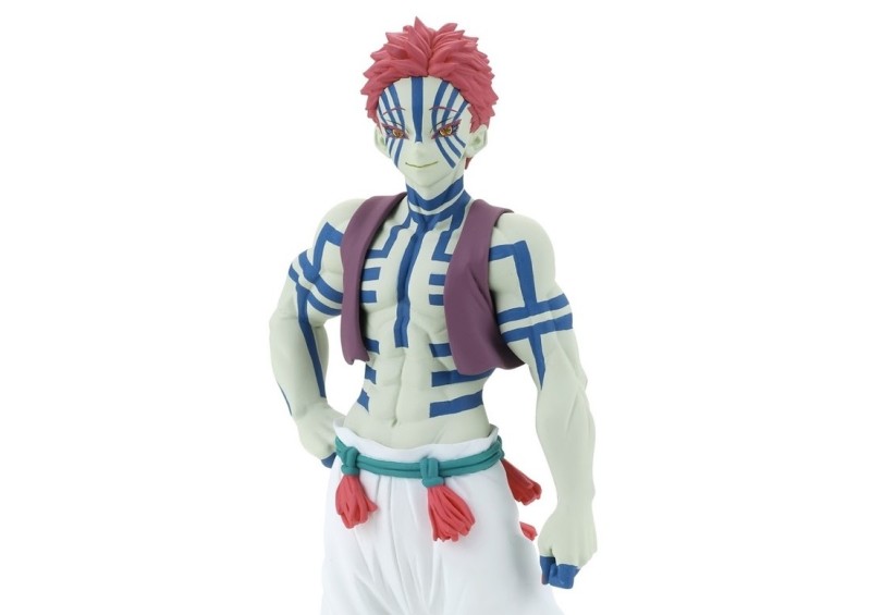 而另一款登場的新角色,則是在無限列車篇大活躍的十二鬼月「上弦之叄 猗窩座」,還原桃紅色短髮、金色瞳眸以及詭異的膚色等特徵,全身刻滿無數代表罪人的深藍色刺青,腳腕上的念珠等細節也仔細還原。