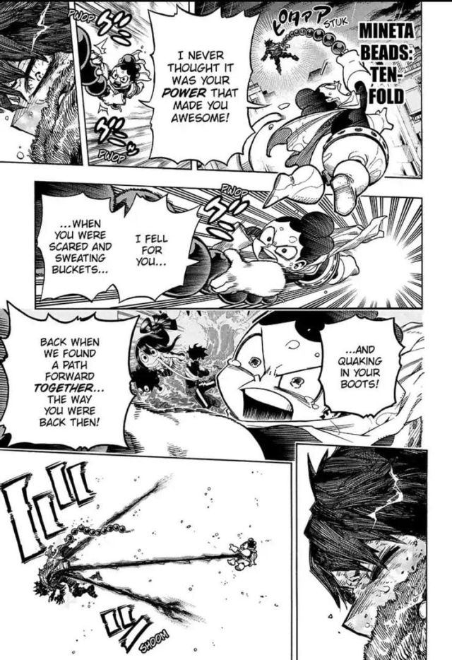 而近日在《我的英雄學院》漫畫最新篇章中,A班同學為了試圖將離開雄英高中的綠谷出久帶回來,不斷地與他戰鬥並進行對話,當中「葡萄」峰田實在對一度失控的綠谷溫情喊話:「不是因為你的能力很帥才喜歡你,而是那個即使冷汗淋漓,卻願意和我們一起前進的你啊!」