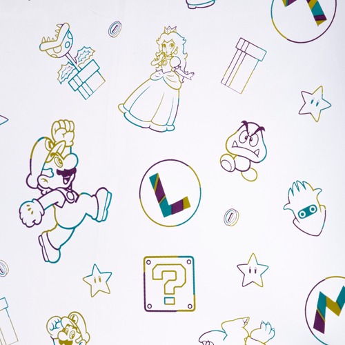 設計的圖樣共有兩種巧思,其中一款包含「香菇」、「無敵星星」、「害羞幽靈」、「水管」、「金幣」等要素集合,並降低飽和度完成80年代卡通風格;另外一款則是用高彩度的霓虹做出安排,可以看見藍色、黃色、紫色的鮮豔線稿,在透明散中呈現一種輕盈剔透的氛圍。