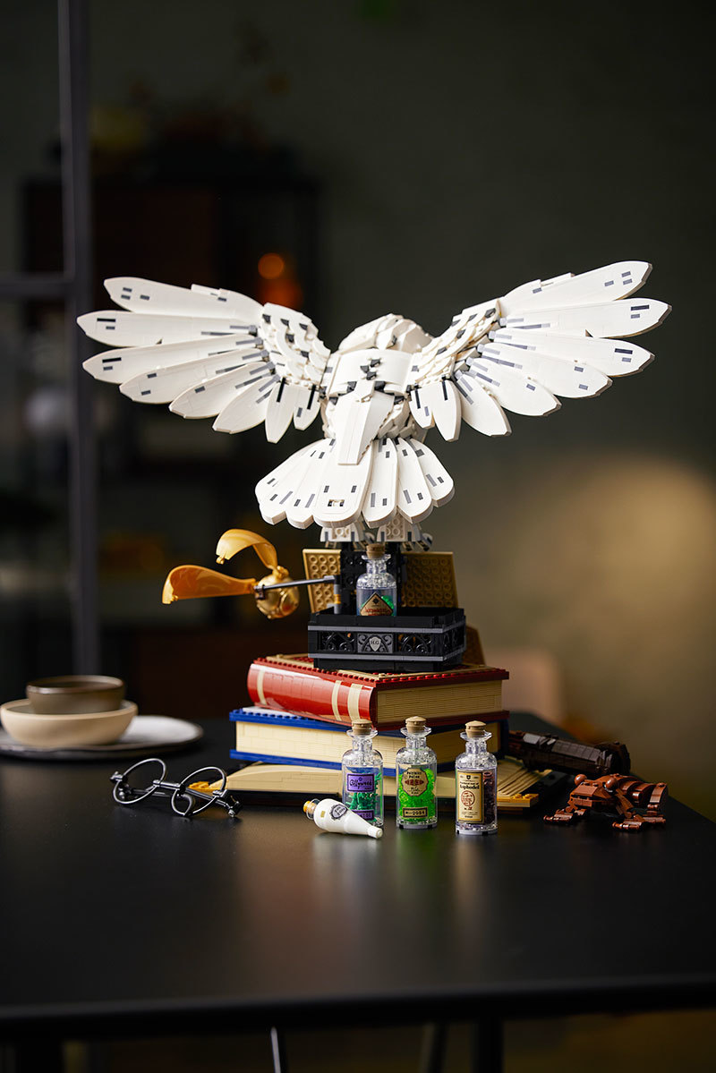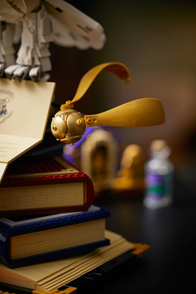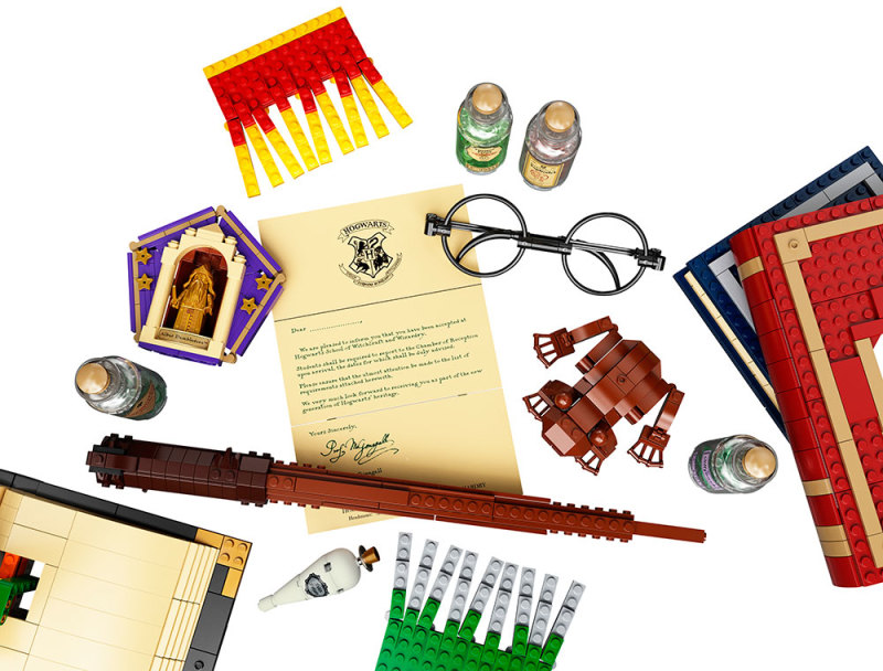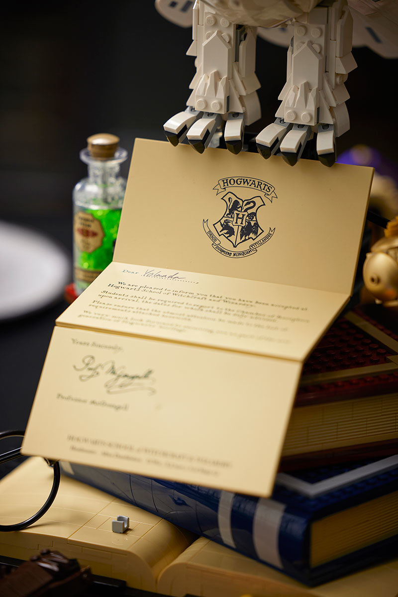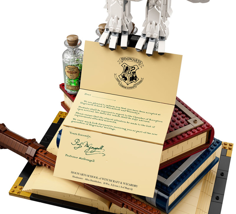 本作是將電影中我們看到的魔法學校-霍格華茲裡的標誌性元素做一個大集合,並且拼成一個展示性極強的模型,零件數不少呢來到 3010 件,組裝完成之後高約 44 公分,寬度則有 50 公分,最搶眼的就是帶著霍格華茲邀請函的嘿美(Hedwig)了,另外還有哈利波特的眼鏡、魔杖、好幾罐的魔藥、金探子、巧克力蛙、湯姆·瑞斗的日記......等經典的道具、魔法物品,超酷!