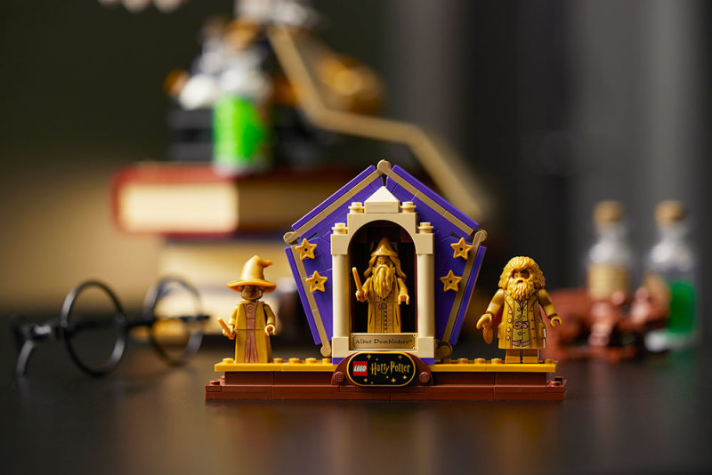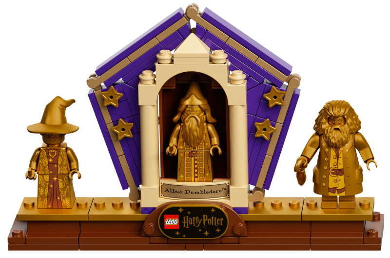 另外,在《哈利波特》電影中深受孩子與霍格華茲學生喜愛的「收藏巫師卡」,這裡則是以積木與金色人偶的形式登場!玩具人可以拼出一個立體造型的巫師卡外框,再將鄧不利多放進去,相當可愛!而且本作還有附上另外兩款金色人偶,分別是海格、麥米奈娃教授,搭配拼上《哈利波特》LOGO 印刷磚的展示底座,整體極具收藏價值。