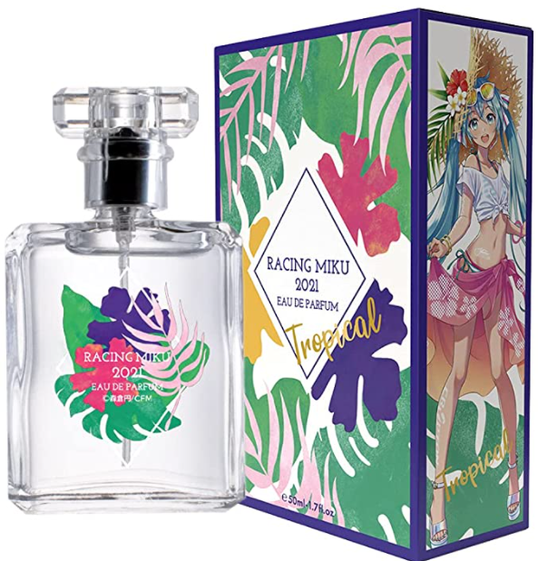 本次由森倉円老師做為主視覺繪畫擔當,香水的三種的版本包含都頗有巧思,第一款為主打運動清爽的「RACING MIKU 2021 香水」,以「柑橘香氣」作為代表,第二款「RACING MIKU 2021 香水 Private」則是由「檸檬香氣」、「牡丹香氣」和「玫瑰香氣」組合女性優柔的的印象;第三款「RACING MIKU 2021 香水 Tropical」則是有夏天味道的酸甜「芒果和百香果」。