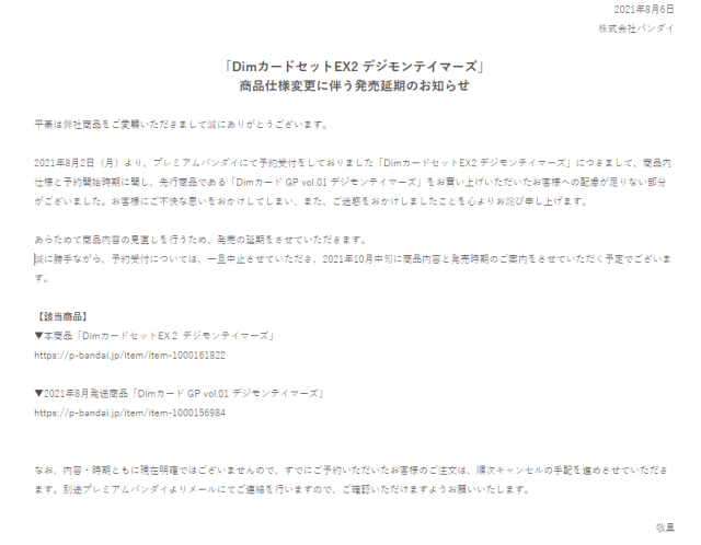 據官方貼文內容表示,由於「Dim Card EX2 Digimon Tamers」卡片進化內容與預購時間並沒有顧及到消費者的感受,故決定將延後發行,並且針對卡片內容再進行調整,預計將在2021年10月中旬才會重新宣布「Dim Card EX2 Digimon Tamers」商品資訊。