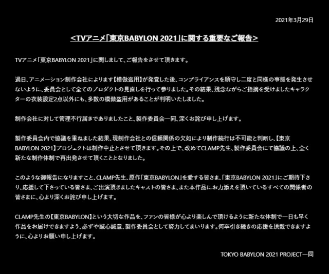 當初《東京巴比倫 2021》因釋出主視覺海報、人物立繪與第一彈 PV 後,被發現有模仿及盜用實際存在服飾的嫌疑。為了不再發生同樣的事情,製作委員會便重新審視企劃所有環節,結果除了先前發現的服裝外,其他部分也有一樣的狀況,在製作委員會商量後決議無法與現在的動畫製作方繼續合作,而停止製作動畫,在今年三月也在官方網站釋出道歉聲明。