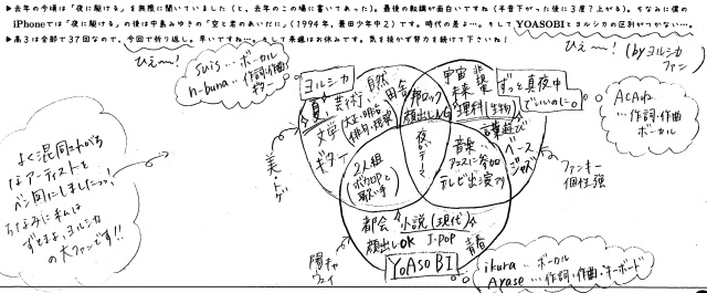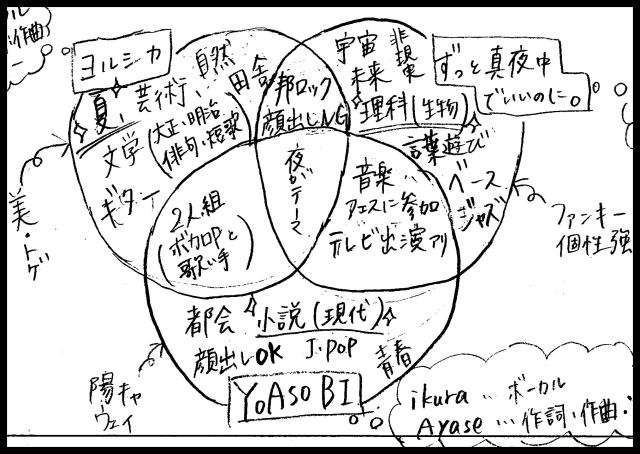 至於三組各自的特色當然也有畫出來。蓑田恭秀以自己的理解寫出各團的關鍵字,YOASOBI 是「都會、小說(現代)、可以露臉、J-POP」,ヨルシカ 是「夏天、藝術、自然、鄉間、文學(大正/明治/俳句/短歌)、吉他」。而ずっと真夜 則是「宇宙、未來、非現實、理科(生物)、文字遊戲、貝斯、爵士」。
