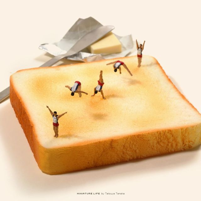 以鬆軟的吐司作為體操場地,讓人一整個不知道該讚嘆選手的表現,還是感嘆好想吃那塊奶油吐司......田中達也的創意就是這麼可愛,讓人覺得整個人都被療癒了。