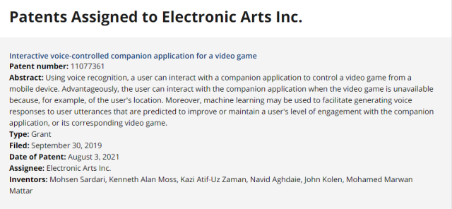 8月3日,EA申請了「語音控制伴侶應用」的全新專利,能夠藉由電子通訊設備的語音來控制角色,這項功能為了補齊玩家因地域因素而無法進入遊戲所研發的功能,意圖在增加玩家的沉浸在遊戲的時間。