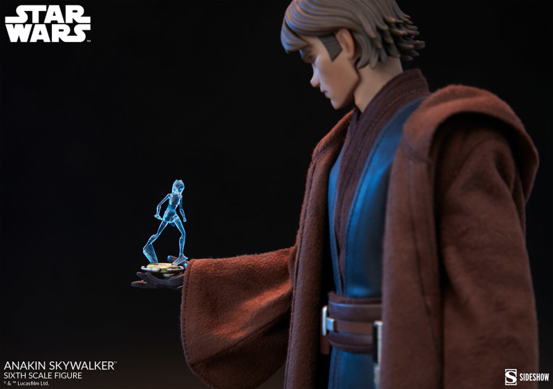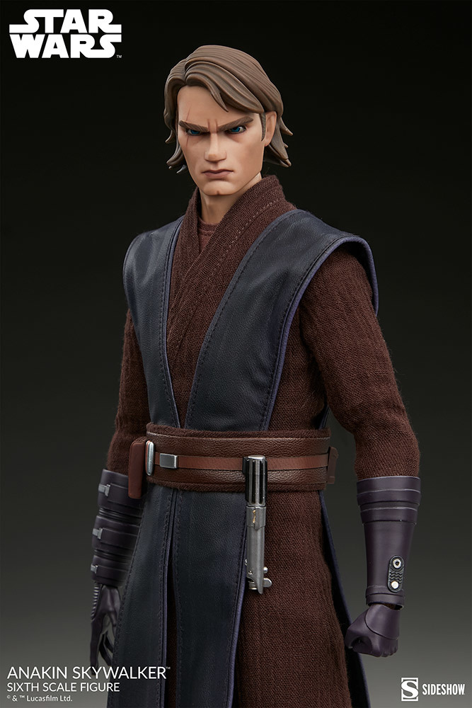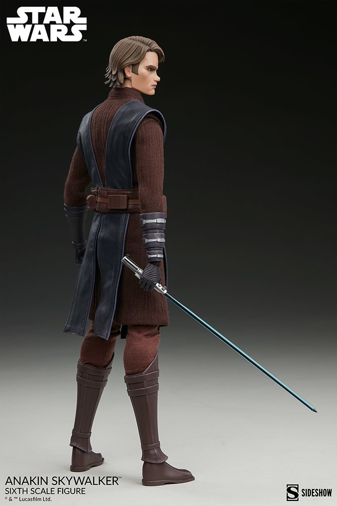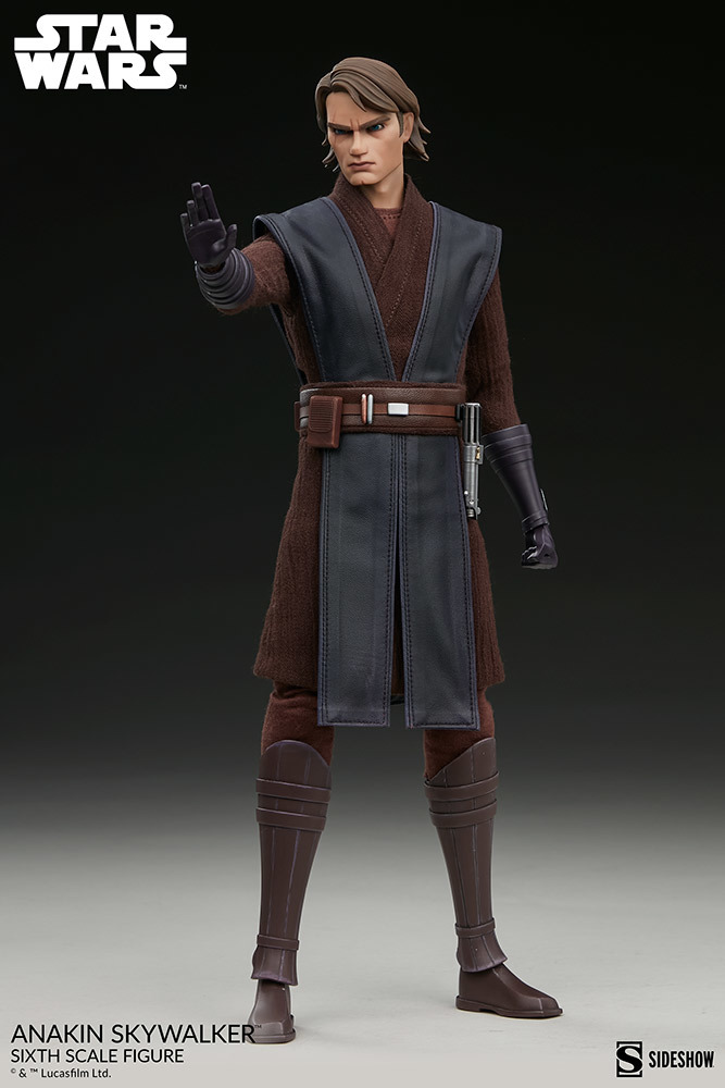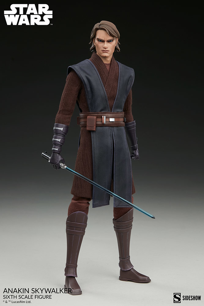 本作高約 31 公分,根據大人氣動畫系列《星際大戰:複製人之戰》的設定充分再現「安納金·天行者」的外觀造型,動畫風格頭雕尤其出色,深褐色短髮、位於右眼的傷痕、面部輪廓都有精美的刻畫,而安納金在複製人戰爭期間代表性的黑褐色服裝,Sideshow 也以真實的布料、皮革質地材料細緻地製作出來,可以將光劍柄掛在腰帶上,還有一件絕地外袍可以披上,搭配多個替換手型即可重現安納金帥氣的光劍戰鬥、施展原力等姿態。