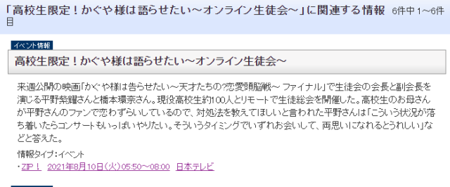《輝夜姬想讓人告白~天才們的戀愛頭腦戰~Final》電影即將在8月20日上映,為了宣傳,特別邀請平野紫耀和橋本環奈舉辦諮商活動「高中生限定 輝夜姬想要讓人說~線上學生會~」,讓兩人以視訊方式解決100個學生的青春困擾。