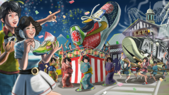 「アトモスヤ」以MY RETRO作為「復古運動鞋」的品牌故事,屆時atmos運動商品店內將展示復古商品,以昭和為日本印象的空間,甚至設計了夏日祭典才有的射靶等裝置藝術,產品將潮流與古風結合的感覺也相當有意思。