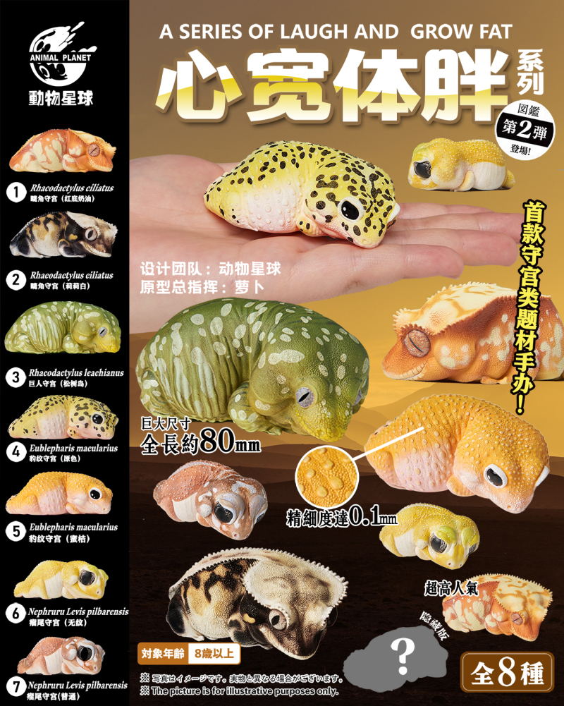 「心寬體胖系列 02」由原型師蘿蔔(梦卜)擔任原型總指揮,將爬寵守宮以圓滾滾的胖胖造型可愛詮釋!收錄有:睫角守宮(紅底奶油)、睫角守宮(莉莉白)、巨人守宮(松樹島)、豹紋守宮(原色)、豹紋守宮(蜜桔)、瘤尾守宮(無紋)、瘤尾守宮(普通)七種款式,每款尺寸約 80mm,以0.1mm的精細度刻劃守宮的鱗片表皮!縮成一團的超萌造型,放在手心或是擺放裝飾都超療癒!