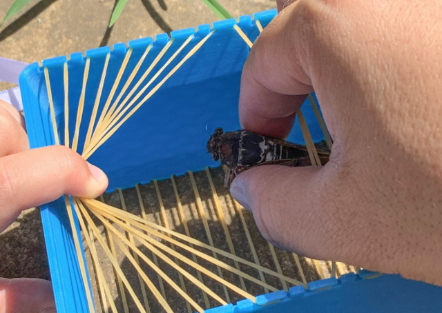 日本一位產品設計師大村卓(@trialanderror50)利用3D列印和橡皮筋製作出一盒簡易的「昆蟲盒」,盒子本體上有鋸齒狀的小口,用橡皮筋一條一條地綑在小口上,形成一個如牢籠般的感覺,當你抓到蟲時只要把橡皮筋構成的牢籠撥開就能把昆蟲放進盒中,而且基本上那縫隙是一般甲蟲、蟬等大型昆蟲鑽不過去的,所以不用擔心昆蟲飛走。