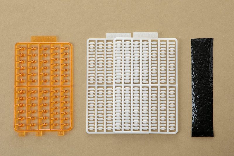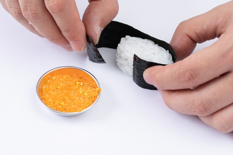 「鮭魚卵軍艦壽司」1/1 比例組裝模型,需要使用粘著劑,將真實米粒大小的醋飯零件黏在一起,並有多達 364 粒的醋飯讓玩家自由發揮~在你好不容易將醋飯一粒粒黏貼好之後,再直接用海苔包起來(底下的飯完全看不見啦?!)海苔零件是特別與食品樣品公司岩崎株式會社合作,製作出擬真的光澤~用海苔包裹好後,再一顆顆放上鮭魚卵,而光亮透明的鮭魚卵也分為大、中、小三種尺寸(共64顆),讓整體看起來更加真實,從裡到外都非常講究!組裝後不用再加以塗裝就有非常高的完成度啦~