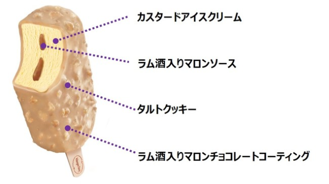「栗子塔」( Marron Tart ) 是一個非常經典甜品之一,以蛋糕塔的概念配上奶油與栗子展現出絕佳風味。這次表現在雪糕上,濃郁的奶油冰淇淋搭配甜甜的栗子醬,包裹在栗色巧克力外層中,點綴著可口的餅乾香脆口感。加入略帶香氣的蘭姆酒,增強了栗子的濃郁風味,是一款非常適合秋冬季節的大人系冰品 。