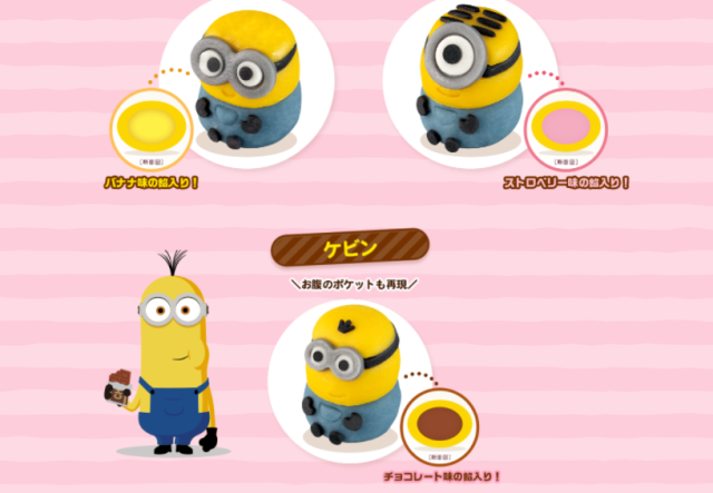 其中三人的內餡口味也不盡相同,「史都華」是草莓口味、「凱文」是巧克力口味、「鮑勃」是代表小小兵的香蕉口味。