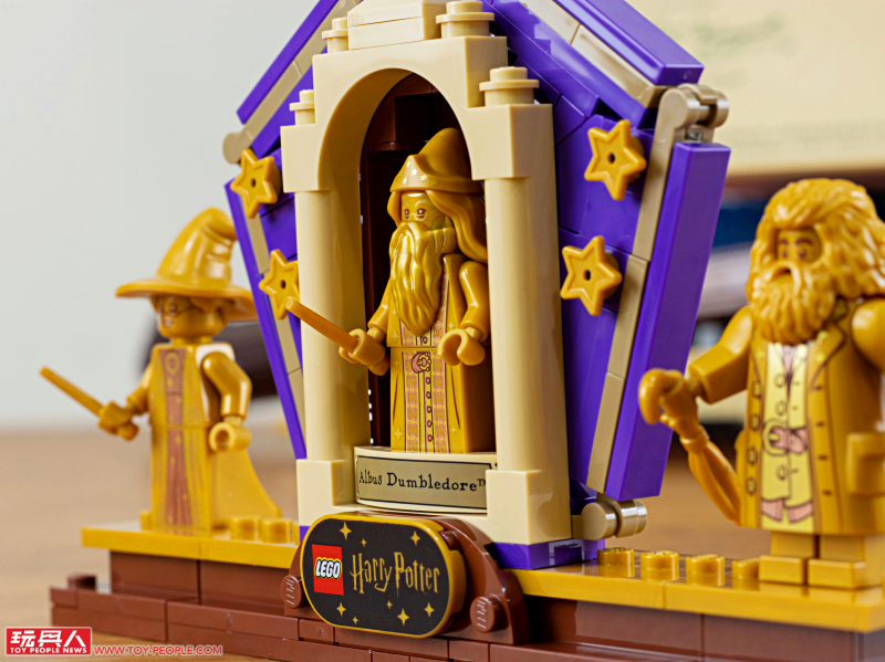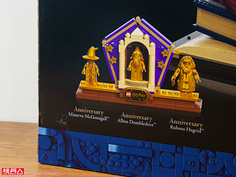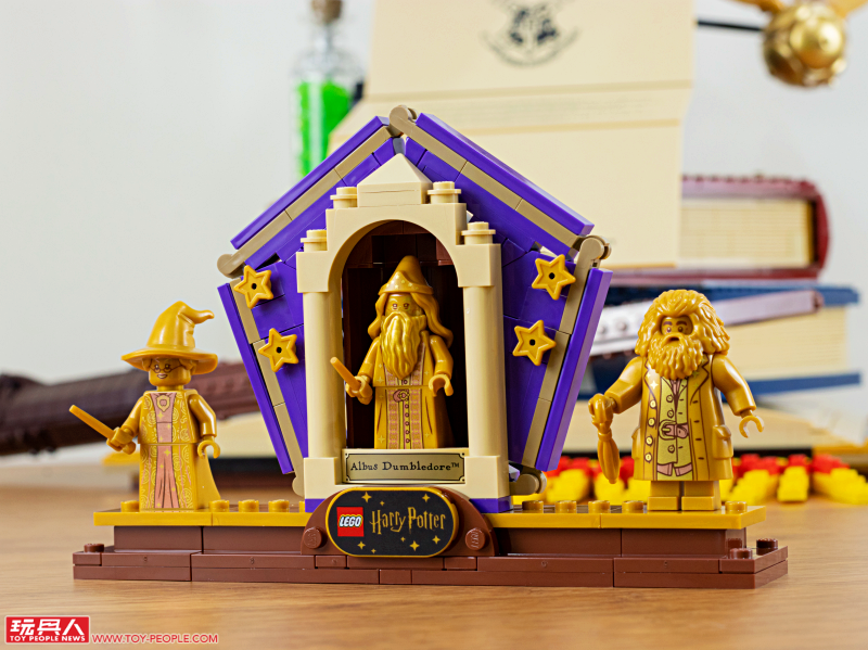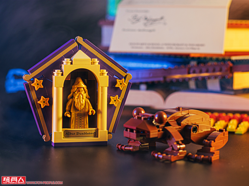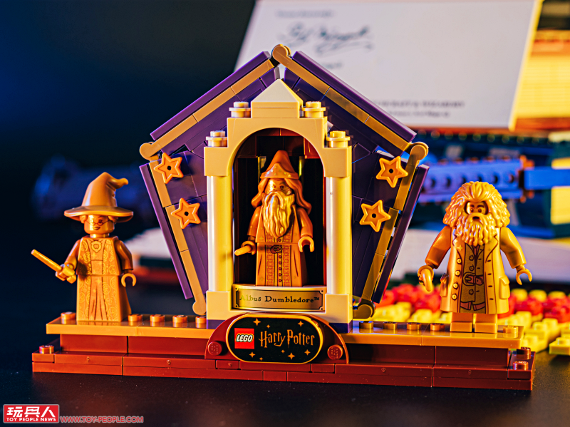 ▼ 終於輪到小編最愛的部分,巧克力蛙巫師卡造型的立體外框、附有樂高哈利波特 LOGO 零件的展示台座,以及本次的 20 週年紀念人偶:鄧不利多(Dumbledore)、海格(Hagrid)、麥米奈娃(Minerva)教授,鄧不利多名字的印刷零件也超級棒。
