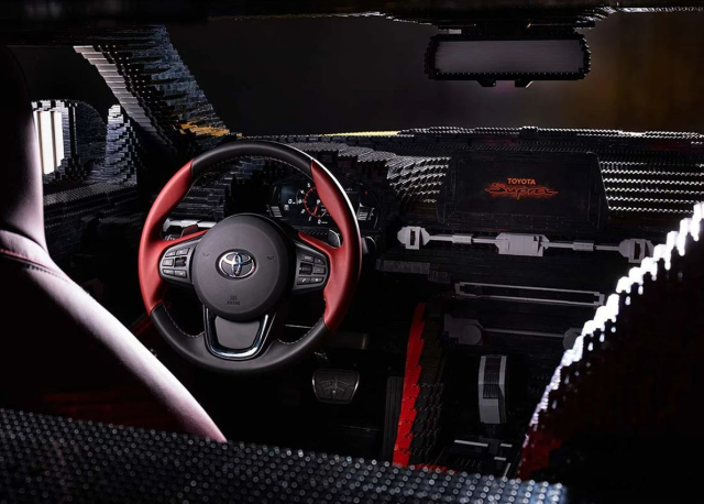 不只是大小、外型都精確地還原到,就連內部的座椅、方向盤、儀表、排檔桿等設備都非常仔細地一塊一塊拼裝上去,而且座椅也是電動可動的,車燈更是能打開發亮,從拼裝到細部構築所花費的時間:設計3000小時,製作2400小時,耗費如此大的時間才能完成這輛樂高版SUPRA。