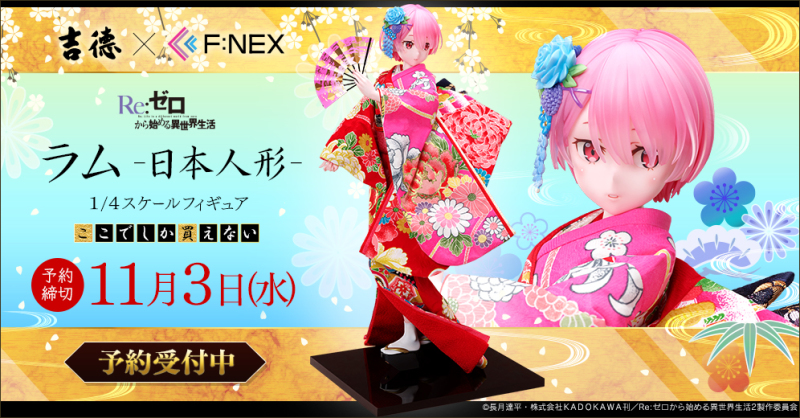 日本知名景品玩具製作公司 Furyu(フリュー株式会社)旗下高品質模型品牌 F:NEX 與知名日本人偶老舖吉德合作,在出自人氣輕小說《Re:從零開始的異世界生活》的「雷姆 -日本人偶- 」後,第二彈最新商品「拉姆 -日本人偶- 」1/4比例模型也尊貴登場,參考售價為 147,400 日圓,採 F:NEX限定・完全預約生產,預計將於 2022 年 03 月發售。