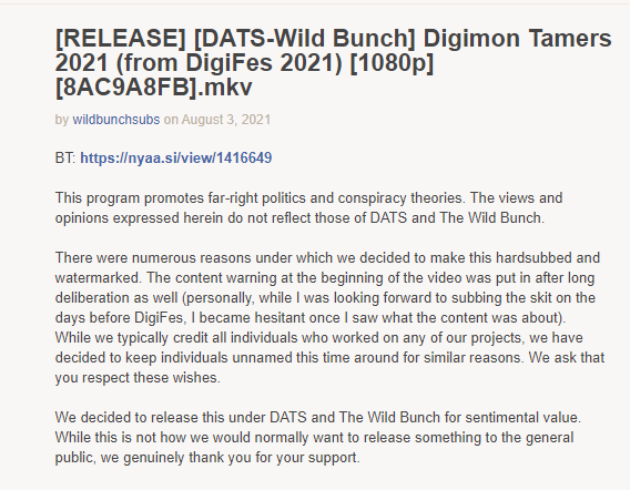 ▼《數碼寶貝》英翻翻譯團隊「The Wild Bunch Fansubs」特別註明,該部朗讀劇含有「帶有右翼政治立場與陰謀論」的註解 (圖/The Wild Bunch Fansubs)