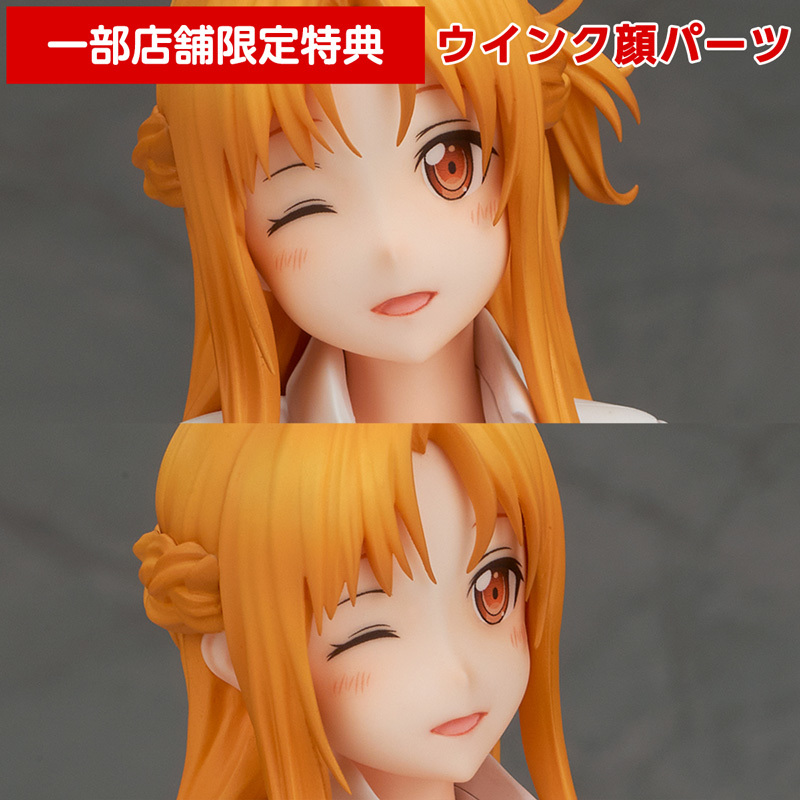 HOBBY STOCK「亞絲娜 襯衫ver.」1/7比例模型,尺寸約高 17 公分,以繪師みうらたけひろ的插畫為基礎,由 Wing 協力製作,將亞絲娜身上僅套著襯衫、敞露出胸前與蜜大腿的性感坐姿立體化,屁股底下的坐墊可以拆卸,尺寸全高約 17 公分;雖然與原畫相比可以感受到明顯的灌水(臉部與胸部都灌很大),但柔軟膚色塗裝的雪白肌膚、臉上雙頰泛紅的溫柔笑容以及若隱若現的襯衫搭配,都充滿迷人的魅力!髮絲、手中的馬克杯等細節也細膩還原~