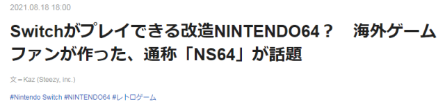 任天堂64(N64)是第五世代的任天堂主機產品,在1996年發售,成為70-80年代人的童年記憶,近期有神人QnadianBacon將最新的Switch改裝,並把N64作為外型,變成一種可以遊玩Switch遊戲的N64造型主機,命名為「NS64」。