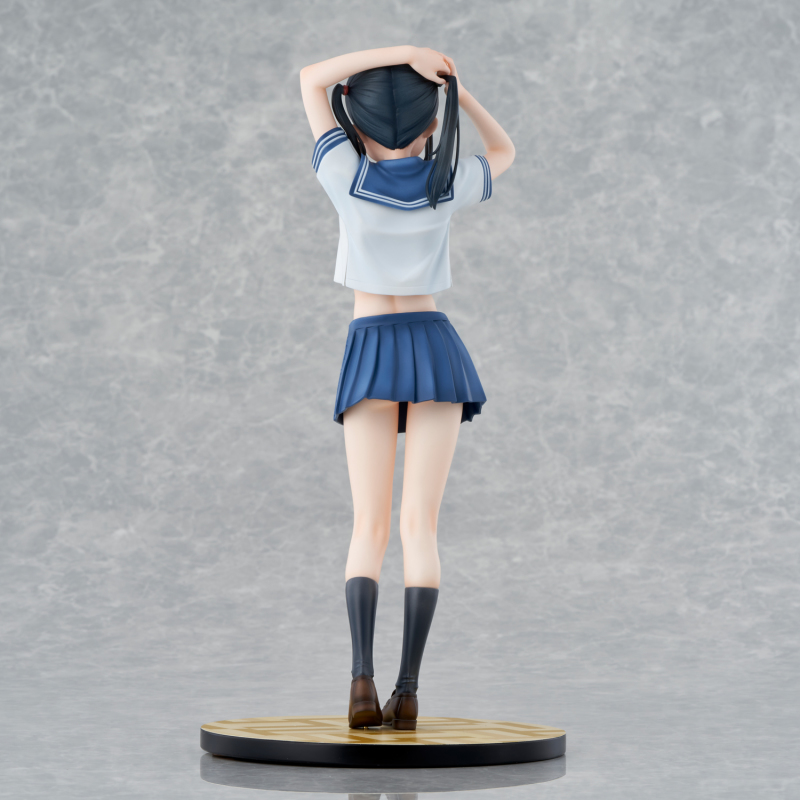 「水手服的裡面」PVC 塗裝完成品,將同名畫集《水手服的裡面》封面中,咬著髮圈、紮著雙馬尾的制服美少女立體化!尺寸全高約 28 公分,由原畫監督完全監修,講究地還原在經典水手服裝下露出肚臍、纖細腰間的魅力造型,臉上可愛又無辜的表情與生活化的動作也精心再現!另外,水手服設計為可脫零件,展露制服底下精緻還原的白色內衣、白色小褲褲,滿足想探究制服裡面的慾望!粉嫩的膚色與股溝、背部等肉體線條施以質感陰影塗裝,整體呈現輕盈通透的少女氣息~