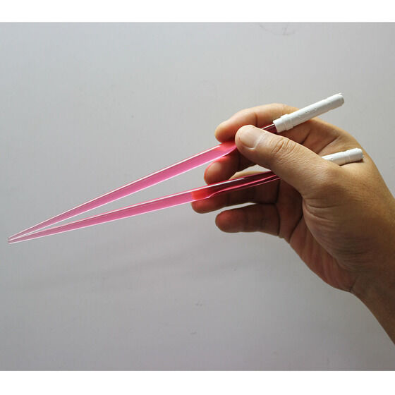GUNDAM Café 這款的「光束軍刀筷子」其實很簡單,以光束軍刀的白色刀柄為筷子的上端,透過粉紅色的光束成為筷子的本體,展現出一把直挺挺的光束軍刀形象。一次上手就有兩把光束軍刀,讓你吃飯武力值破表,遇上壞人都不用怕了呢 ( ? )