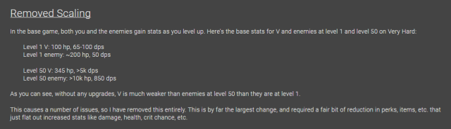 這項任務的改動可以說是「牽一髮而動全身」,他幾乎重製了《電馭叛客2077》的武器數值,使玩家的享受體驗更舒適,並且藉由更新讓「食物」更有作用、「更改醫療道具的CD」、「添加新的24種藥物」--於是「移除等級動態難易度」的副作用是「等級造成的影響變小」,但製作者 Scissors123454321並不在意,他表示「這會使圍繞的技能變得更有趣!」