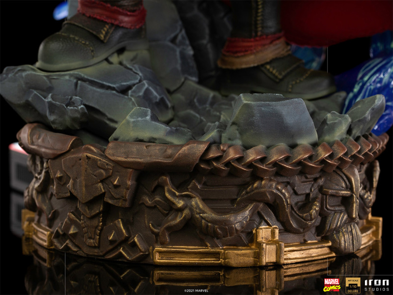 本作高約 28 公分,根據漫畫裡的經典外觀,再現了雷神-索爾手持招牌武器「妙爾尼爾」、威風凜凜的挺立站姿,翅膀造型的銀色頭盔、妙爾尼爾的鐵鎚部分展現出厚重、堅硬的金屬質感,服裝細膩刻畫出皺摺、皮革紋理,與隨風飛舞的飄揚動感,粗壯的雙臂跟結實的胸腹也逼真地形塑,就連妙爾尼爾上頭的字樣更是考究地還原;在索爾身後,還以藍色特效件打造出一個類似多元宇宙的通道,讓大人氣的索爾蛙(Throg)也同步登場,超有趣!