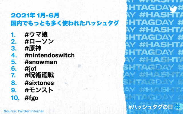 在 2021 年上半年 ( 統計為 1 月至 6 月之間 ),在這個排行榜上可以看到多為動漫作品與遊戲相關的文字上榜,也有藝能相關的文字出現,可以視作為日本上半年度在推特上最多人討論的話題。