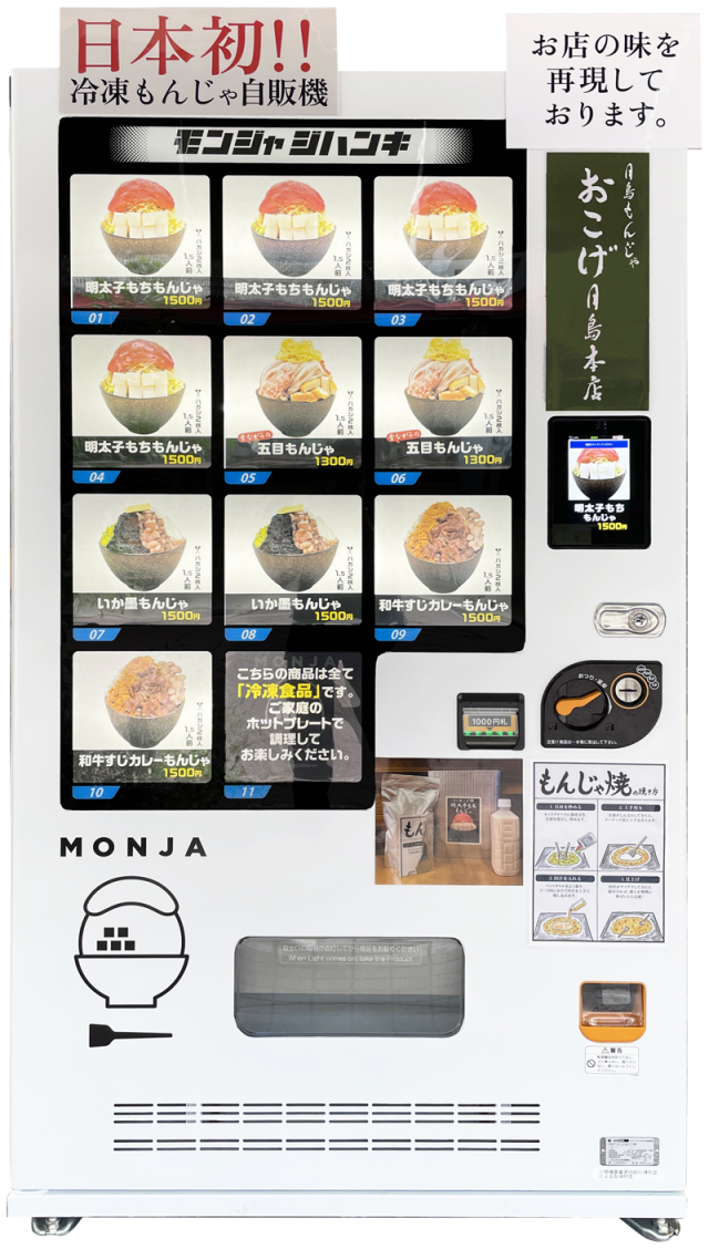 這是由「月島もんじゃ おこげ 月島本店」推出的販賣機,不管哪種口味,都是以冷凍包形式販賣,包裝內含了一包器材包和一瓶麵糊,還很貼心地附上文字燒的製作方式。販賣機提供了四種口味:明太子麻糬、墨魚、什錦、和牛咖哩,每個口味都是從豐洲市場嚴選食材製作並做好冷凍處理,所以可以安心食用。