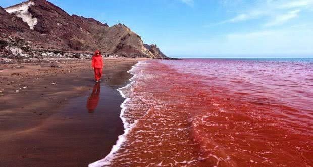 根據推主與網友介紹,這是位於伊朗一個很有名的海岸叫做霍爾木茲島,由於因為當地具有相當豐富的氧化鐵,而讓海水呈現了宛若《福音戰士新劇場版》的鮮紅色場景。也因為如此,外地遊客們也將這片海浪另稱為「紅海灘」、「彩虹島」,或是以血紅色的色調來稱呼「血液海灘」。