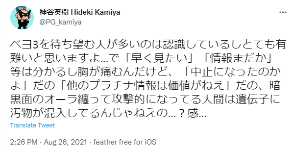 看來是受到了玩家的壓力,神谷英樹表示「非常感謝眾多期待《魔兵驚天錄3》的玩家,對於『想早點見到!』、『新情報還沒推出嗎?』之類的呼聲本人也能感同身受,不過那些被髒東西纏住的人說『這款遊戲開發停止了吧!』、『其他白金工作室消息毫無價值!』--講這些話的人哪,你們的基因是不是混進了什麼髒東西?」