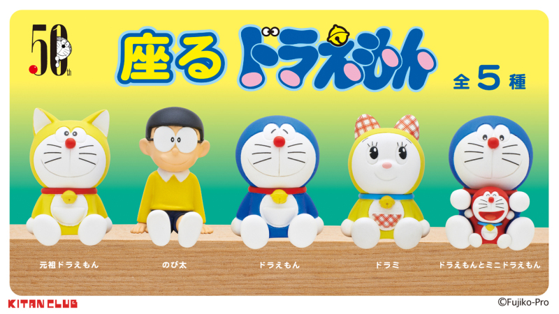 向來以動物為主題的「坐著系列」轉蛋,這次融入了經典的《哆啦A夢》角色,將圓滾滾的哆啦A夢、大雄以坐姿呈現,高度約 33 ~ 39 mm,精緻可愛的造型加入雙腳伸長、靜靜坐著的行列~本次收錄的陣容有:哆啦A夢、大雄、黃色有耳朵的元祖哆啦A夢、哆啦A夢與迷你哆啦A夢,以及妹妹哆啦美五款角色。雖然沒有明顯特別標示有 50th 等字樣,但哆啦A夢溫柔的表情和可愛造型,也是粉絲必入手收藏~