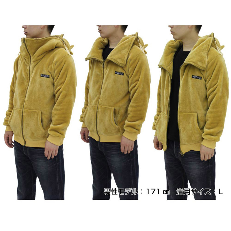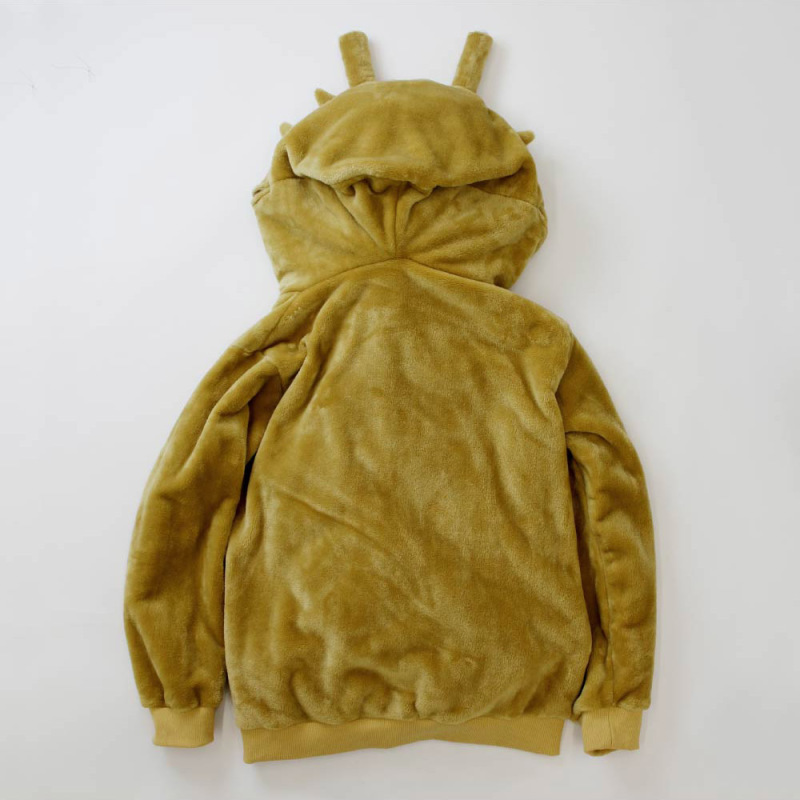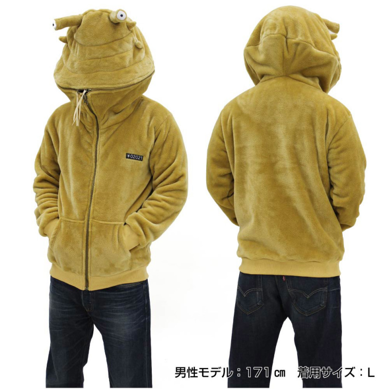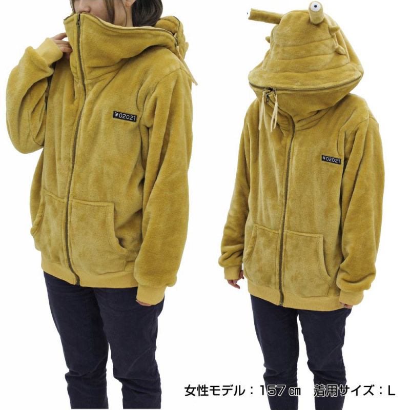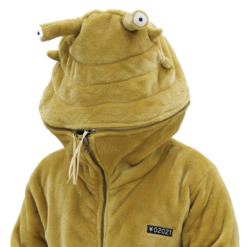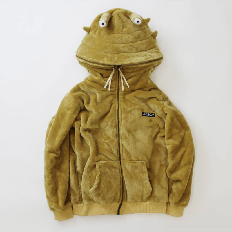 「吃錢怪獸 卡內貢 連帽外套」,整體還原卡內貢金銅色的配色,並在連帽上設計有卡內貢的眼睛、頭上的刺等特徵,戴上帽子、大大的嘴巴造型拉上拉鍊後,整個人就化身為卡內貢啦!外套以和絨毛玩具一樣的蓬鬆材質製作,除了觸感柔軟,在寒冬時穿著也能兼具保暖~黑色眼睛和胸前的金額顯示器採用刺繡再現,並繡上了代表今年度的 ¥2021 日圓~不快點多吃一點錢,小心就要掛掉啦~(※溫馨提醒:連帽拉鍊拉上後,會看不到前面阿)