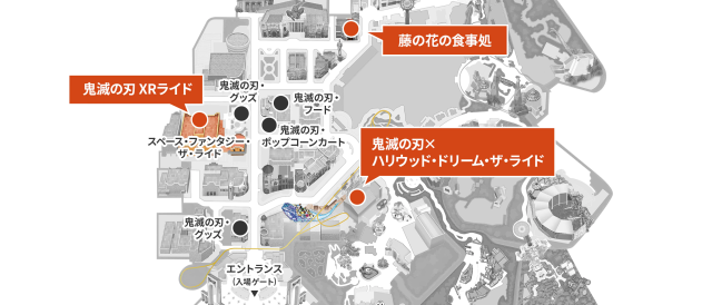 目前大阪環球影城仍設有《鬼滅之刃》的遊樂設施區域,不過「紫藤花餐廳」是設置在紐約區的蜘蛛人遊樂設施旁,想去參觀的朋友可參考以下地圖。