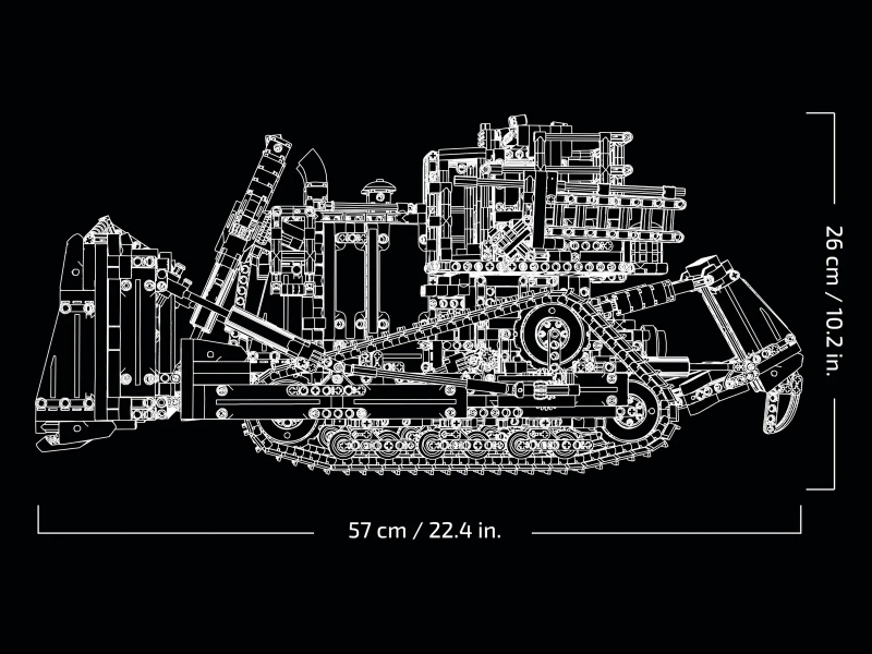 本作共有 3854 片零件,組裝完成之後長度來到 57 公分,以極具存在感的尺寸重現這台黃黑配色的重型推土機,除了高度還原的外觀結構之外,藉著專屬 APP「CONTROL+」所能達到的豐富操控體驗也相當令人期待,包含前進、轉向、推鏟的升降與傾斜,以及移動爬梯跟鬆土器......等,動力部分一共附上 15 號馬達、大型(L)馬達各兩個,還有一個主機(Hub),要注意的是,這台樂高卡特彼勒D11推土機模型要動起來還需要 6 顆 AA 電池,各位玩具人記得事先準備好喔!