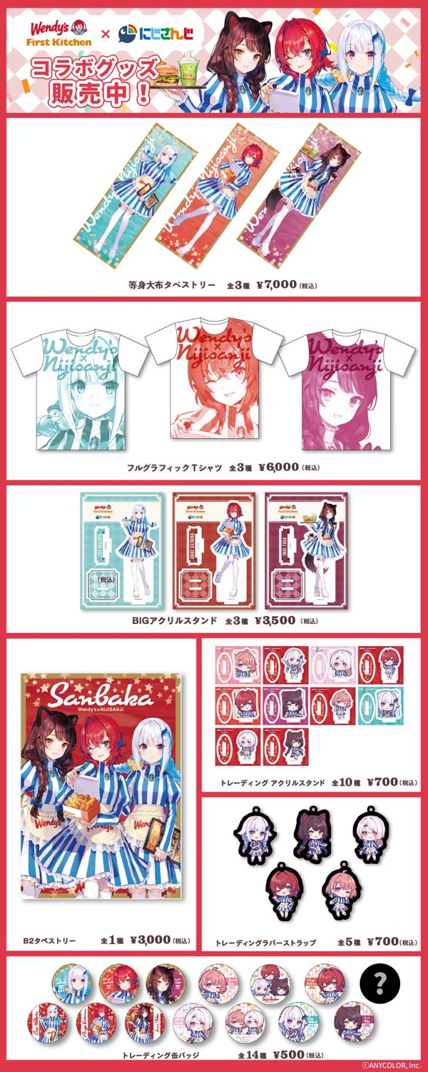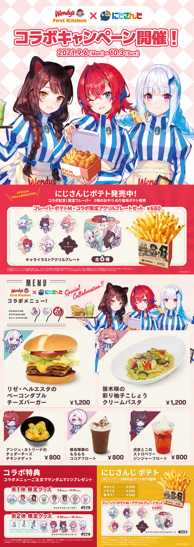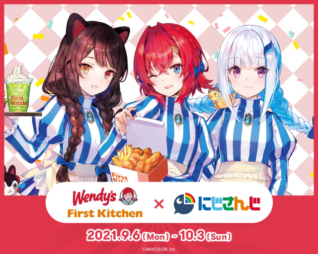 這次與旗下的 Vtuber 合作,出現在宣傳插圖的包含;莉澤·赫露艾斯塔(Lize Helesta)、戌亥床(戌亥とこ)與安潔·卡特莉娜 ( Ange Katrina ),三人都是《彩虹社》非常具有人氣的 Vtuber,這次將穿上溫蒂漢堡的制服替各位服務啦~