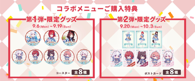 只要點選聯名餐點,就會贈送特典禮物,分為兩個時段贈送不同的特典。第一彈為聯名杯墊、第二彈則為聯名的明信片,兩款都是全八種隨機贈送。