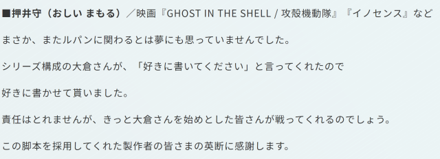 其中押井守在訪談中提到,萬萬沒想到又能加入《魯邦三世》相關的製作。系列構成的大倉先生對我說「請隨便寫」,所以我就隨便寫了 XD。相信製作團隊相信我的劇本,會製作出非常棒的作品。