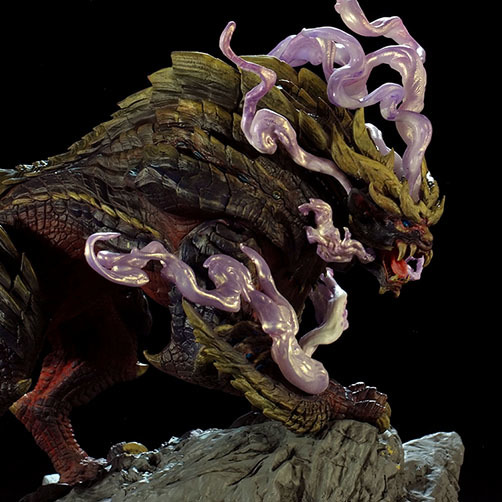 「CFB Creator's Model 怨虎龍」由知名原型師岡田惠太擔任原型製作,擁有全高約 26 公分尺寸。除了呈現怨虎龍原本的設定,也融入原型師重新詮釋的造型,雕塑出充滿威嚴的堅硬甲殼、橫眉豎目可怕面貌,全身散發鬼火立於崖上,彷彿準備朝獵人展開襲擊!