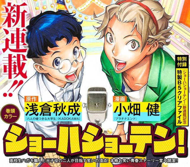曾與大場鶇共同搭檔創作出《死亡筆記本》、《爆漫王。》、《白金終局》屢創名作並且為人所知的精緻作畫小畑健於今日集英社宣布將要於 10 月 4 日發售的月刊漫畫雜誌《Jump Square》第 11 號上與新的搭檔原作淺倉秋成推出新連載《ショーハショーテン!》。