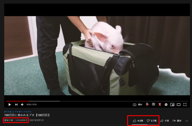 這支第「100天後將會被吃掉的小豬:第100天」的YouTube影片,除了觀看人數高達了190萬人次以上的觀看數外,可以看到就連讚數與倒讚的部分也分別呈現了4.2萬的Like與2.7萬的Dislike,當然底下留言更是有不少網友,甚至知名YouTube的各種不同的觀點,有的人認為這是與小豬之間的信任背叛,但也有人卻認為這確實是給自己上了一堂名叫「生命教育」的課程,而這也讓人不由得想起知名漫畫《銀之匙》所傳達的意義。