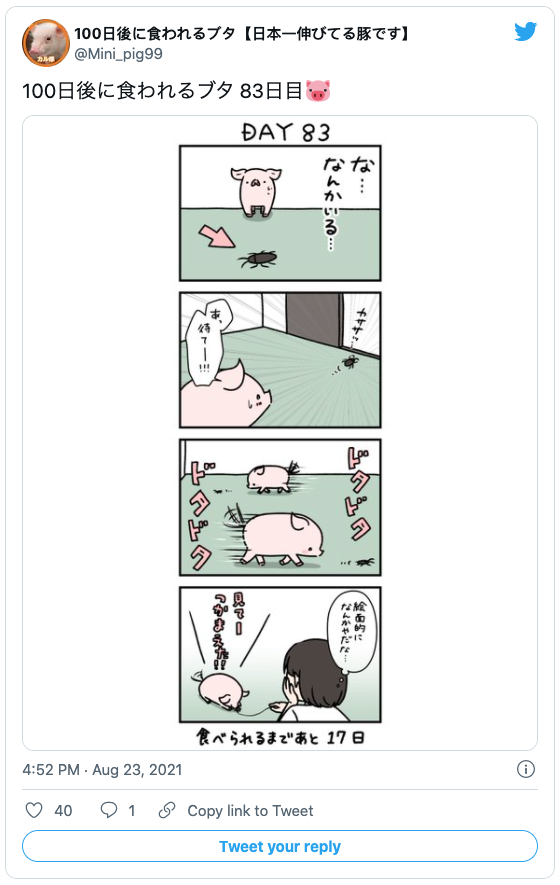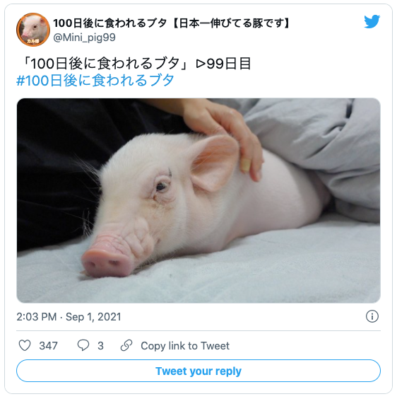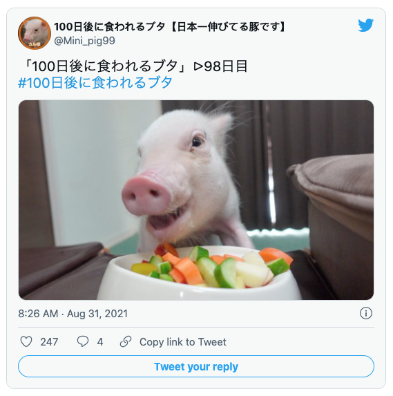 約在2021年5月25日這天,Twitter與YouTube頻道上出現了名叫「100天後將會被吃掉的小豬(100日後に食われるブタ)」,也很明顯是模仿於知名四格漫畫《100天後會死的鱷魚》(100日後に死ぬワニ)命名,而創立該頻道的目的,不僅僅是紀錄這100天內飼養這隻名叫「五花肉」的小豬過程,重點是最後這隻小豬的命運究竟如何…是不少網友關心的事情。